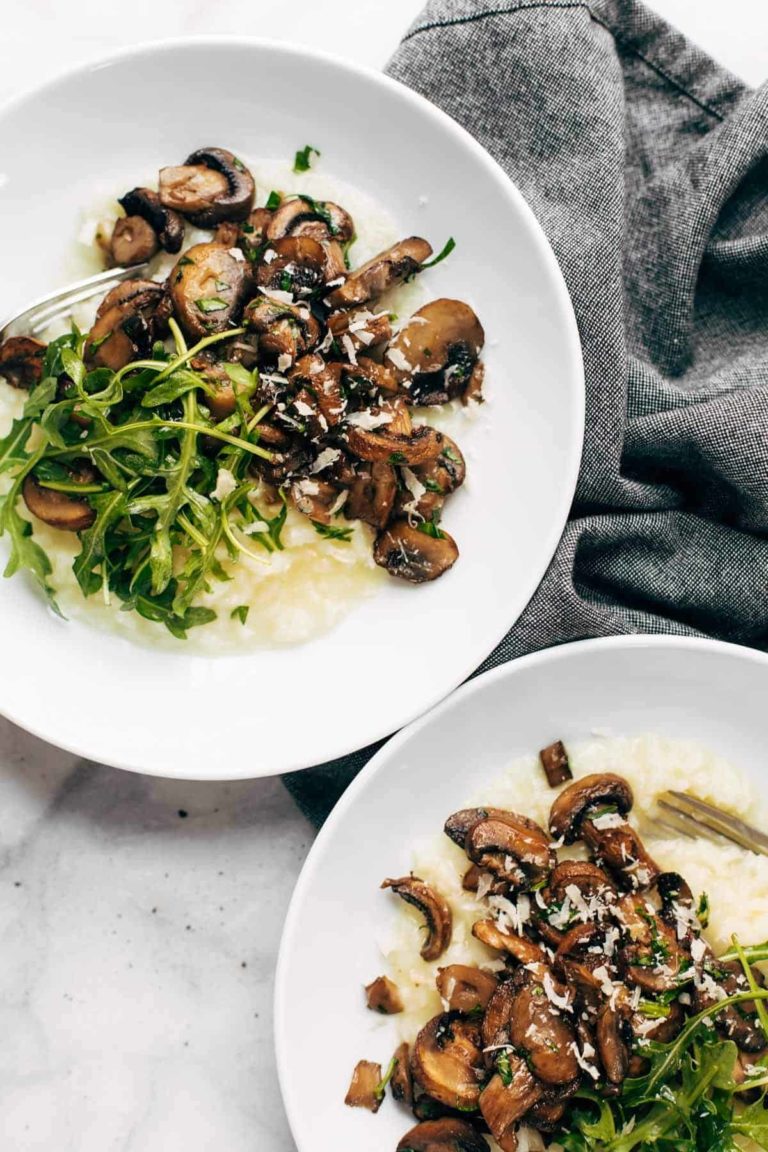 The best easy risotto – made in the oven! Served up with some garlic roasted mushrooms and a lemony arugula salad. YUM!