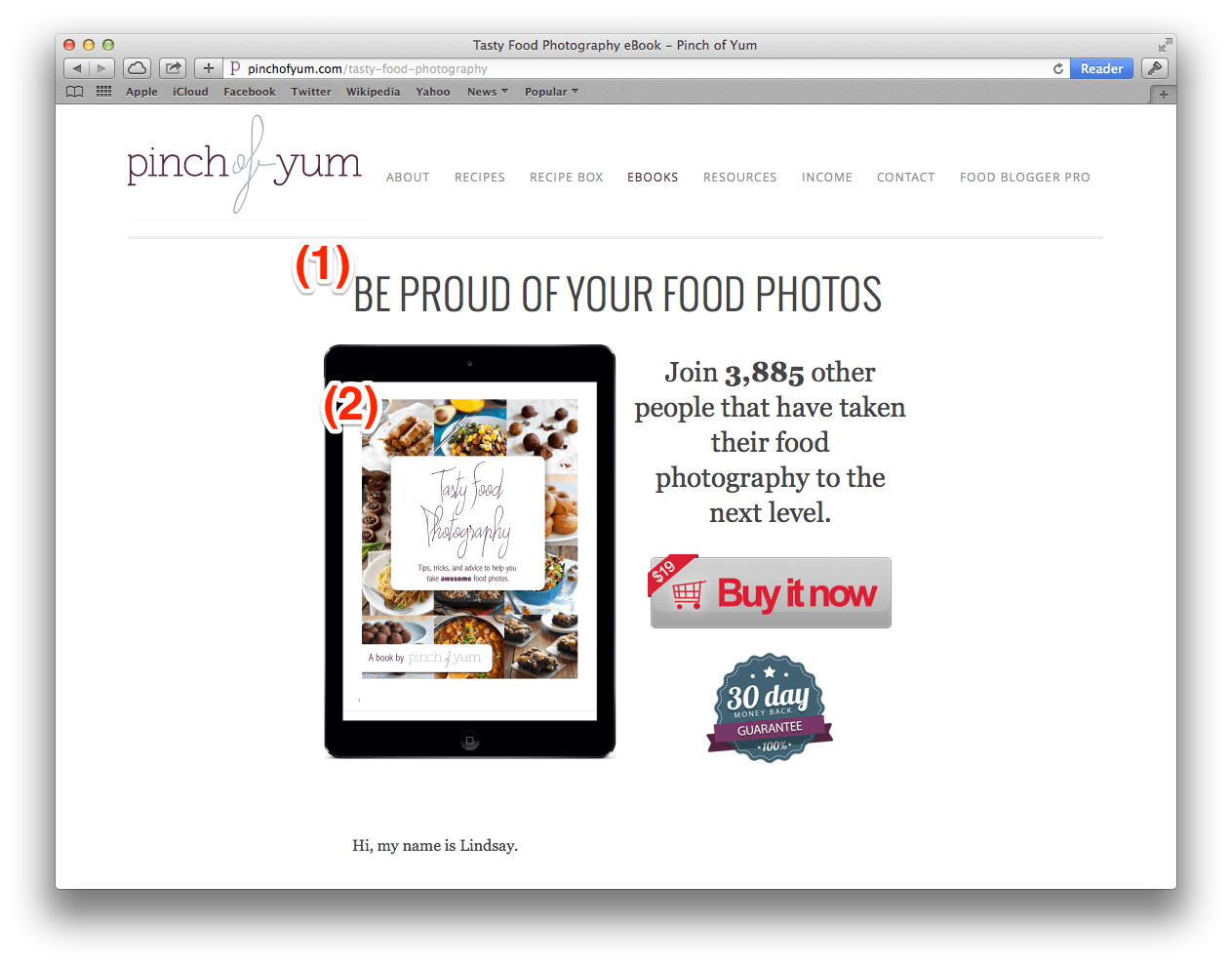 The two changes we made to strengthen our conversion coupling was to (1) change the header text of the landing page to read “Be Proud of Your Food Photos” and (2) include a cover image of the eBook.